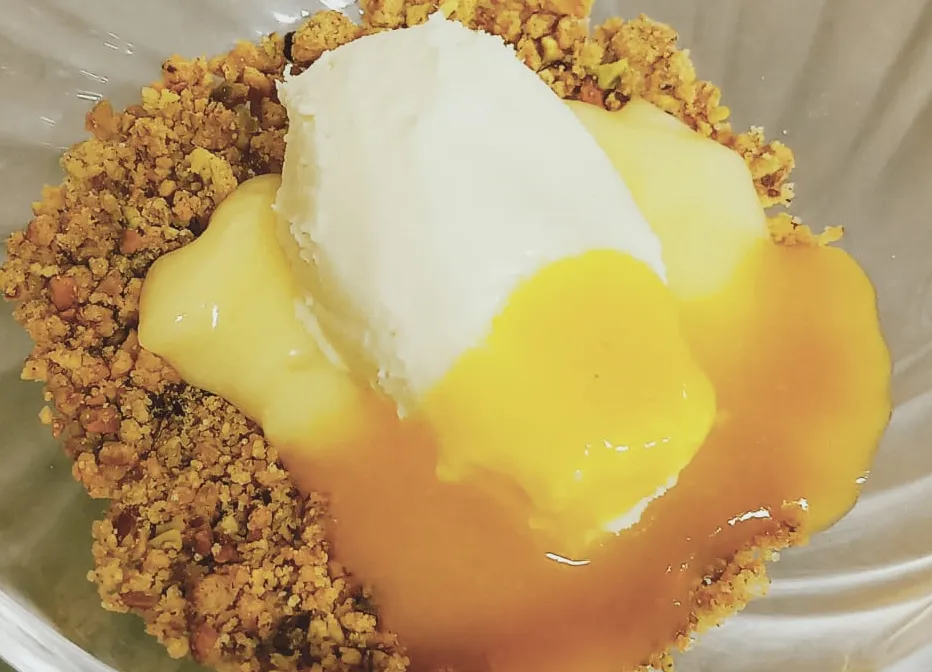 Wit chocolade-timbaaltje met citruscurd, pistachecrumble & warm kruidige mandarijnsaus -1098-