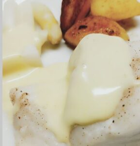 - Leg 2–3 witte asperges op een bordje. Plaats daarop de kabeljauw. Nappeer rijkelijk met mousselinesaus. Voeg enkele goudbruine krieltjes toe. Werk af met wat extra peterselie of een drupje citroensap.