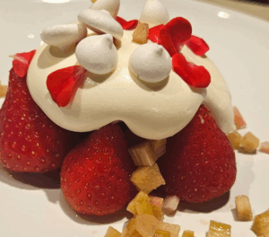- Plaats een handvol aardbeien in het midden van het bord en giet wat slagroom hierover. Verdeel een beetje gemarineerde rabarber rondom. Bestrooi het gerecht met rozenblaadjes en meringue topjes.