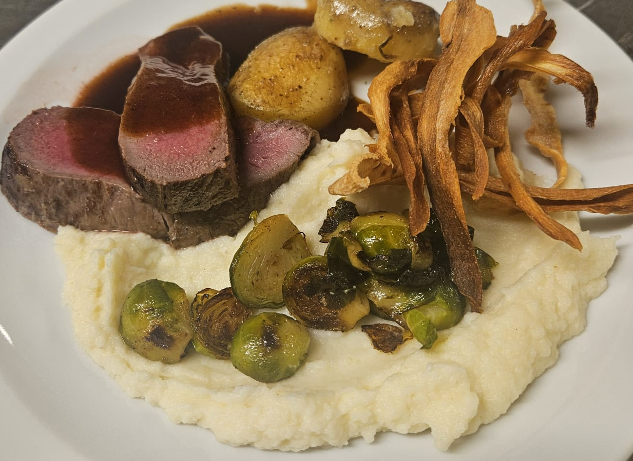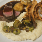 Filet van hert met rode wijnsaus, knolseldercrème, fondant aardappel, spruitjes en krokante pastinaak -1083-