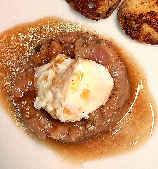 Kalfstartaar met Kwartelei en Balsamico-Sinaasappel Vinaigrette. -1031-