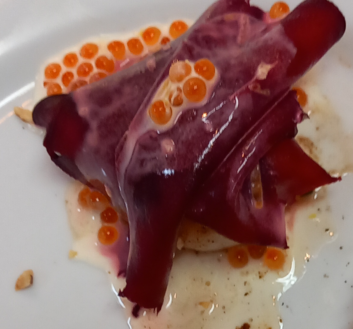- Kruid de Sint Jacobs vruchten met pezo. Bak deze in boter. Plaats een Sint Jacobs vrucht op een bord. Bestrooi ze met wat hazelnoten. Bedek de Sint Jacobs vrucht met een paar plakjes rode biet. Giet een beetje rood saus erover